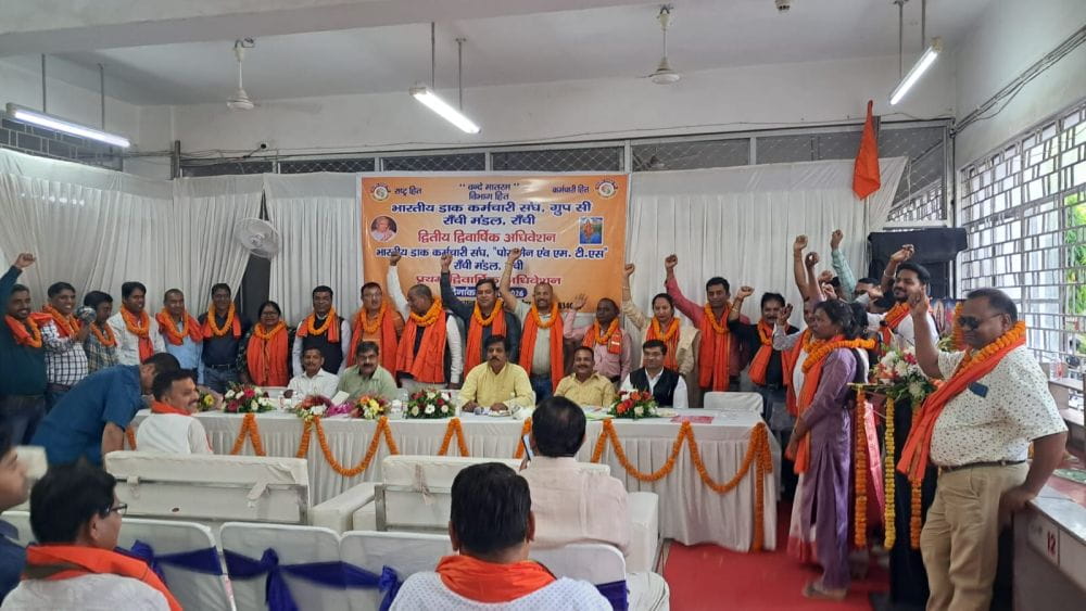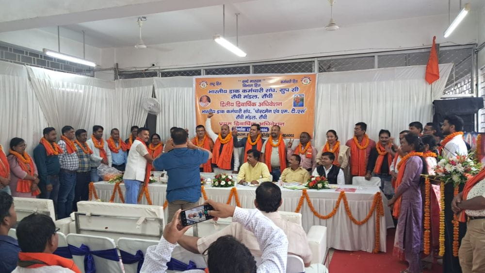 दिनांक 12-04-2026, दिन रविवार को भारतीय डाक कर्मचारी संघ, रांची प्रमंडल का द्वितीय द्विवार्षिक सम्मेलन सफलतापूर्वक संपन्न हुआ। सम्मेलन की अध्यक्षता श्री श्याम सुंदर कुमार जी ने की।