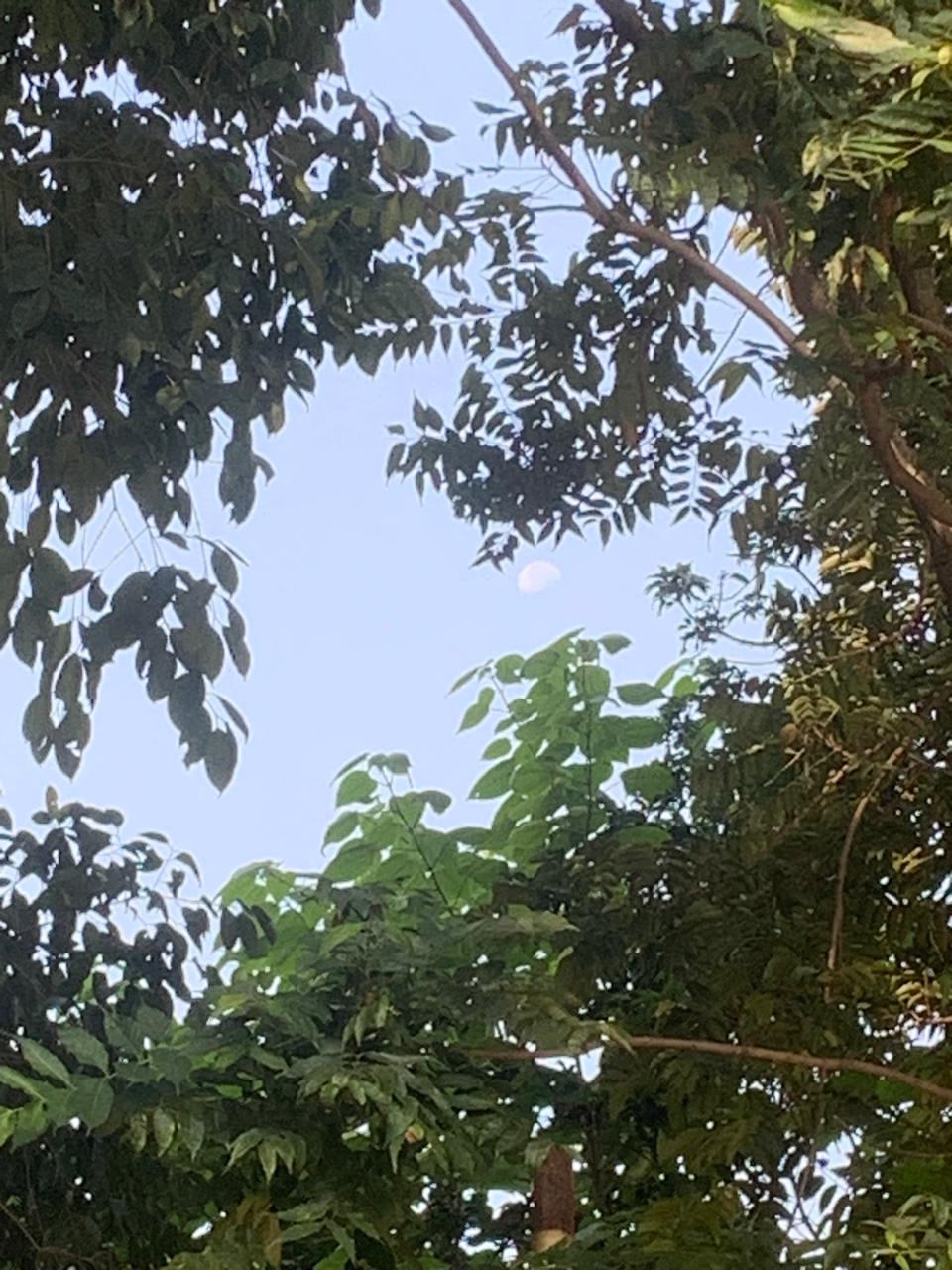 *Vidible Half Moon( five days after Kartik Purnima on November 5,2025) in middle of green leaves of green trees inside Jharkhand Civil Service Officers Institute, Ranchi at 7 am on November 10,2025.
