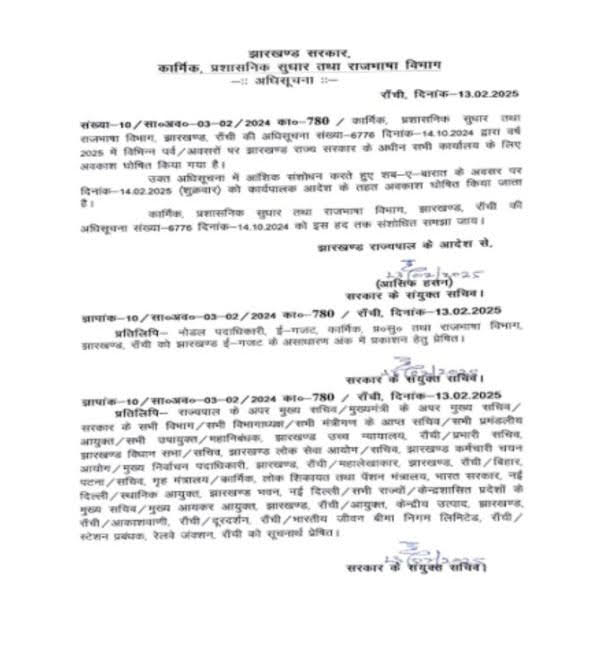 Jharkhand is not alone. Even the West Bengal government has declared holidays on February 13, Thursday, and February 14, Friday.