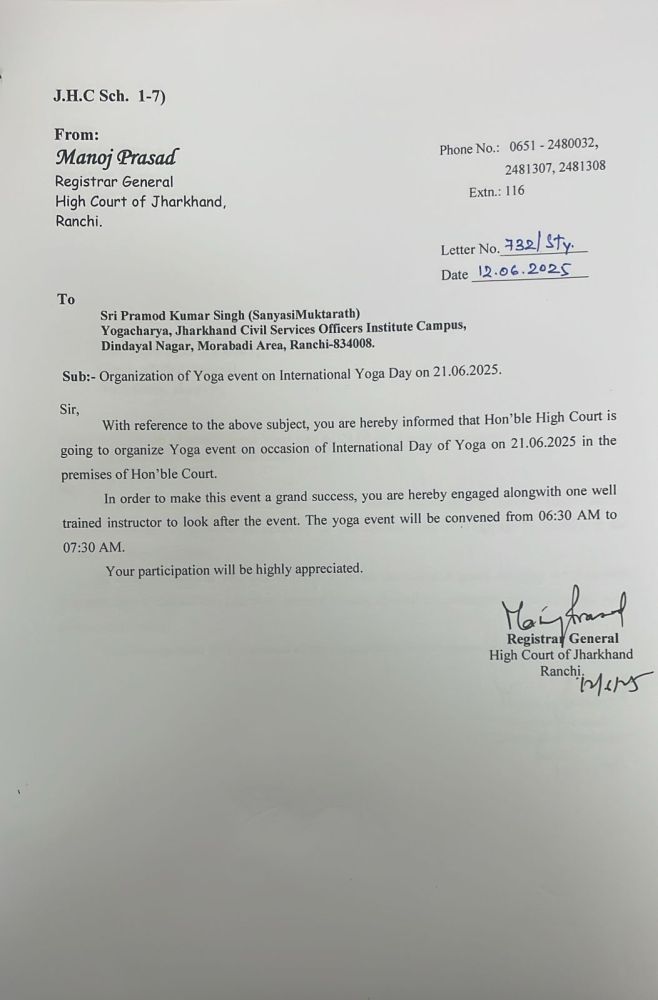 Manoj Prasad, Registrar General of the High Court of Jharkhand, has in his letter dated June 12, 2025, has informed that “ Honourable High Court is going to organise yoga event …”